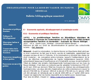 Nous sommes heureux et enthousiastes de vous annoncer la reprise de la parution semestrielle du Bulletin d’information bibliographique du CDA qui, je l’espère, vous permettra de mieux renforcer votre connaissance des problématiques que soulève notre bassin du fleuve Sénégal et qui ont pour noms : la protection de l’environnement, la gestion ressources hydrologiques et énergétiques, l’invasion des mauvaises herbes aquatiques, la gestion foncière et les politiques de développement, etc.