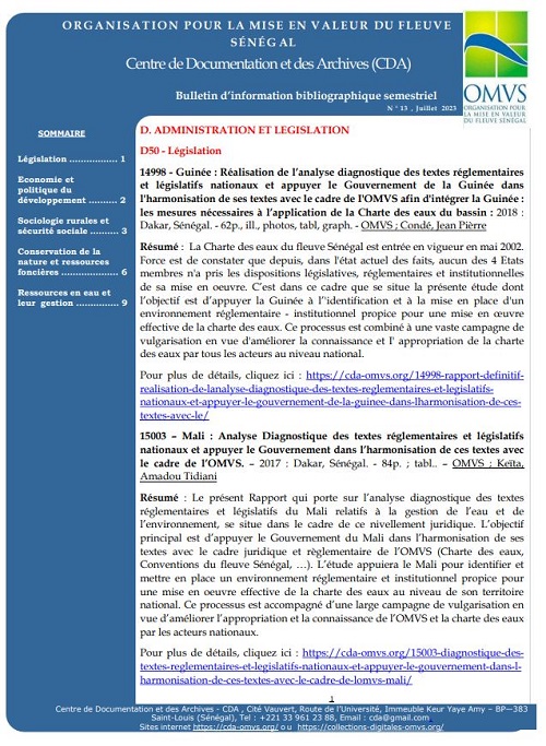 Les questions de législation dans la gouvernance des eaux, le foncier, le programme navigation de l’OMVS, la coopération dans le domaine de l’Eau, la santé dans le bassin, l’environnement, les changements climatiques, l’actualisation du SDAGE, la cartographie du bassin, l’orpaillage dans le bassin, etc. sont entre autres les thèmes qu’abordent le 13ème numéro du bulletin d’information bibliographique du CDA que nous diffusons entre ces lignes.